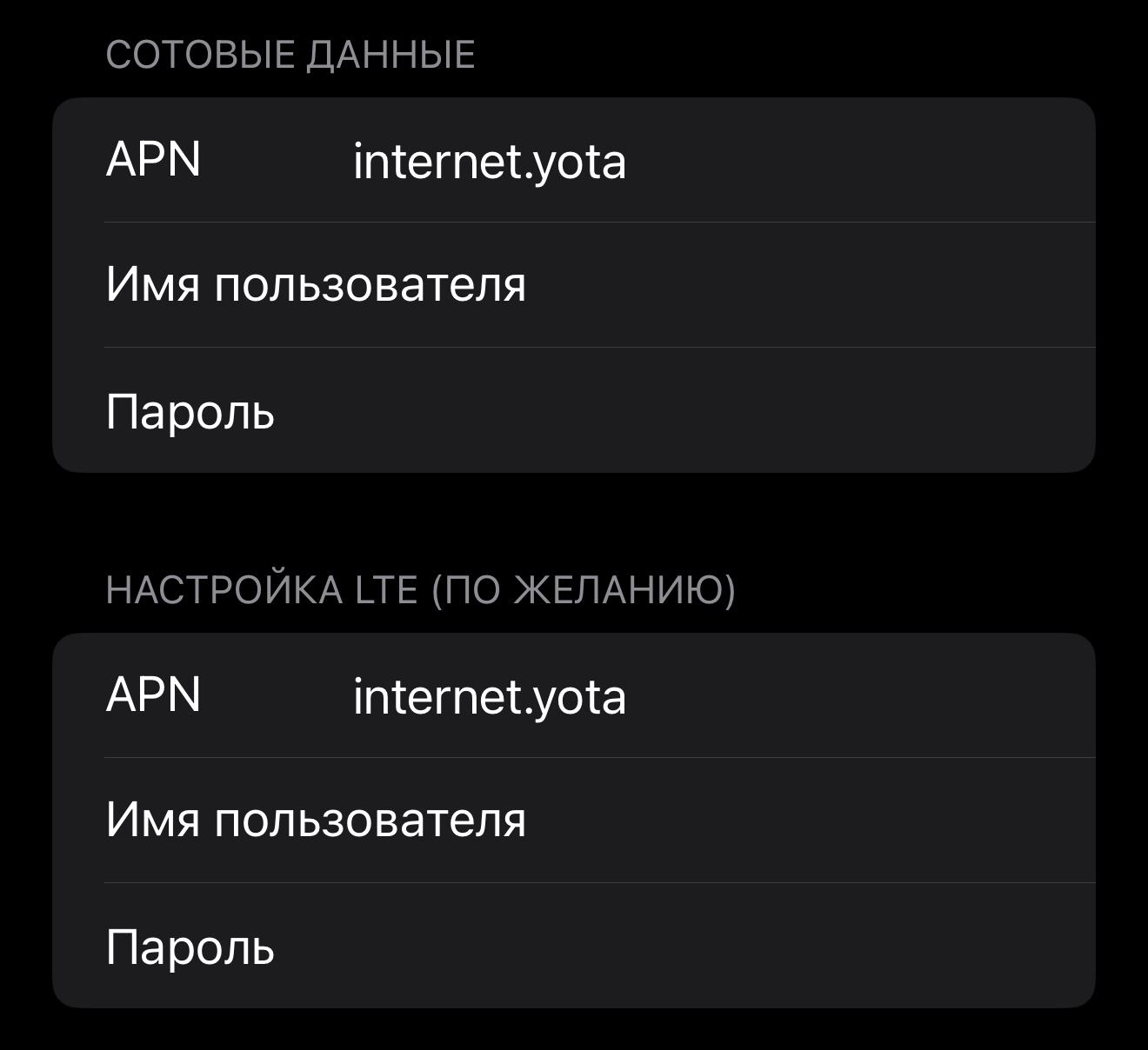 APN: internet.yota Имя пользователя —(оставить пустым) Пароль —(оставить пустым)